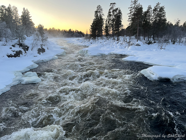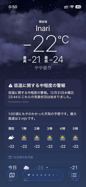 フィンランド北部は太陽の登らない極夜の時期ですが、日中の南の空は朝焼け・夕焼けみたいに明るくなります。